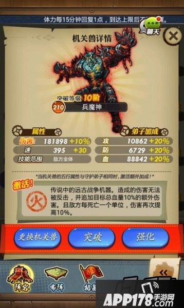 目前第一速度365,激活395基本上是晓梦大师必备机关兽。同等级7阶实战伤害略逊于青龙,但是后期如果能二次出手可能逆转局势。最贵的兵魔神的最大作用就是增加额外伤害,力挽狂澜。