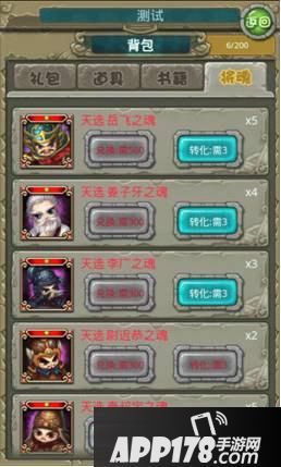 获得的将魂全都在背包的将魂一列里,当将魂达到相应数量,即可点击【兑换】按钮兑换成武将了。