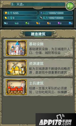 国会是主城核心建筑,也是众多功能建筑的“母体”,点击进入国会,即可查看到建筑列表,建筑列表包含基础设施、资源建筑和士兵建筑三大类。