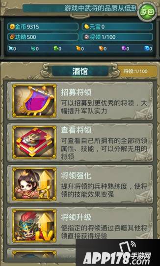酒馆是将领集中营,在这里你不仅可以招募将领、查看将领、强化将领,还可以升级将领和进化将领,点击酒馆建筑即可查看所有酒馆功能。