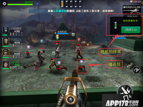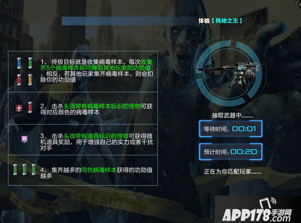 病毒样本分为红、蓝、黄、绿4种颜色,击杀带有这类颜色符号的僵尸就可以获取该种颜色的病毒样本。另外还有一种头顶问号的僵尸,击杀后会随机获得某种颜色的病毒样本,随机获得的病毒样本可以在3秒内选择放弃,这是为一心想做大的玩家准备的。除了这些带有病毒样本的僵尸,游戏中还添加了一种附带道具的丧尸狗,每隔30秒左右刷新一次,每次只有4只,这个是大家必须抢的怪物,要知道道具可是非常强力的东西。