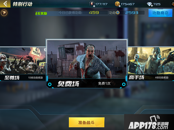 特别行动是《抢滩登陆3D》中的一种玩法模式,每天有三次免费场,另外还有不限制次数的高手场和至尊场,但是需要消耗一定钻石才能参加。这也是目前游戏中最直观的PVP模式,每次匹配4人,每人占据一个平台通过击杀僵尸获取病毒样本,集齐5个病毒样本即可赢得其他玩家的功勋。你没看错,是直接获得敌人的功勋值,病毒样本相同颜色越多获取的功勋就越多。这个模式就是这么直接、简单、粗暴。