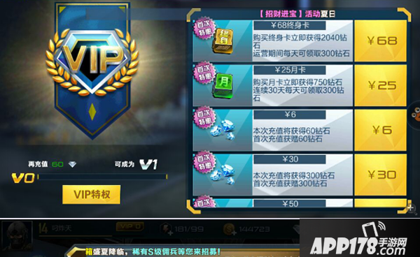 好了介下来,我们需要弄一些游戏中最重要的货币钻石,怎么样充钻石划算呢?这就是个学问了。首先当然是有充值活动的时候充划算,这个应该地球人都知道。然后就是我们需要有每天固定的钻石来源。《抢滩登陆3D》很贴心的有两种优惠卡可以获得钻石,一种是25元的月卡,购买月卡可以立即获得750钻石,并且连续30天每天可以领取300钻石;另外一种是68元的终身卡,购买终身卡可立即获得2040钻石,游戏运营期间每天可领取300钻石。