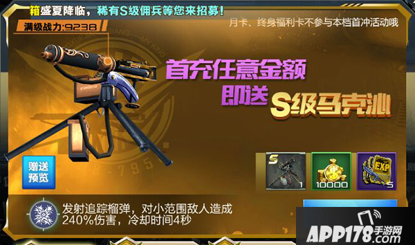 S级武器马克沁一把,10000金币,5张中级枪械经验卡。有了这把S级武器,你初期闯关腰也不酸了,腿也不疼了,轻松加愉快,这样你在单位时间内所获得的收益就将远远大于那些不充值的玩家。
