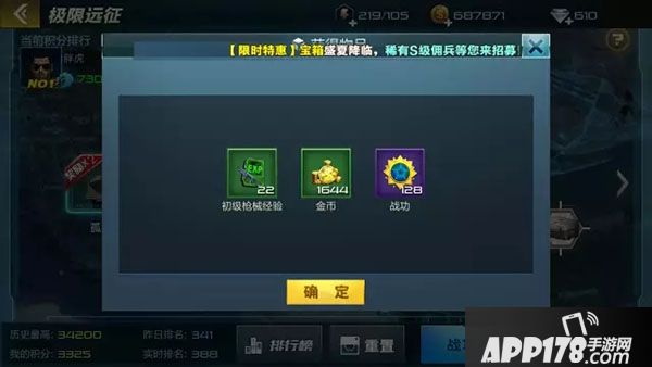 每关顺利通关后点击领取奖励会返回到极限远征关卡模式,当通关后,后面的宝箱就会自动开启,点击宝箱领取你所得到的奖励,大量的武器经验卡和特殊货币等着你来取走哟!