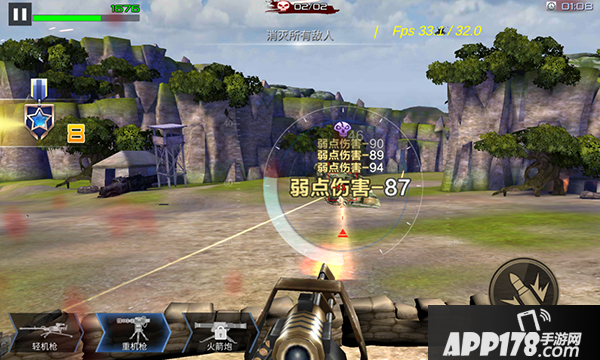 但是尴尬的问题总会出现,子弹射光了,面对这个移动堡垒,我们还能有什么办法呢?对,没错,在1-3的时候,我们获得了一把新的武器,就是在屏幕左下方的重机枪,点击切换到重机枪,将这辆重型坦克击毁吧!