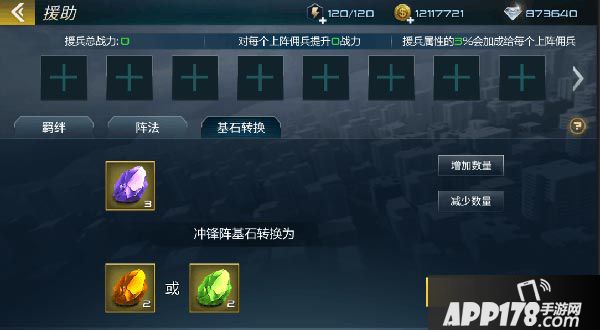 阵法的升级是通过基石原石内开出的石头相对应升级的,假如您获得固守阵的石头过多,想升级冲锋阵呢,可以通过基石转换进行哦~