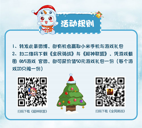 转发微博,小米手机与游戏礼包等你来拿!除此之外,65圣诞季的圣诞惊喜根本停不下来!扫二维码下载《全民骑战》与《超神联盟》,凭游戏截图@65游戏官微,还可获价值50元游戏礼包一份(每个游戏ID只限一份)!这个圣诞,绝对惊喜!