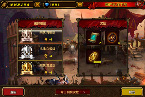 英 雄请一定活着回来,别闹我就打个低级版本不会挂。65手游《全民骑战》斯巴达活动分成三大难度,20级青铜,35级白银,50级黄金。不同等级面对的怪物 强度不同,当然奖励也是不同的,越高级奖励越丰厚。不过这里提醒大家的是,斯巴达副本没有时间限制,但是挑战一样需要消耗体力,挑战次数会在第二天刷新。