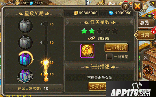 3. 日常任务品质分为1星~5星,星级越高,奖励越丰富,任务领取以后依旧可以刷新星级,不改变任务内容;
