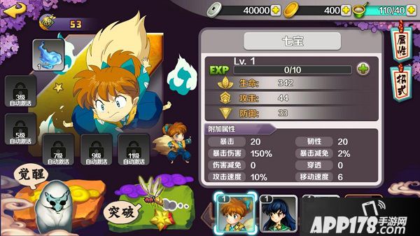 七宝:萌货一枚,技伤害也不是很高(也不低,但考虑到其他技能未开出),攻击范围超强,基本覆盖全屏,属于犬夜叉-觉醒手游的首选推图角色!可以重点培养!