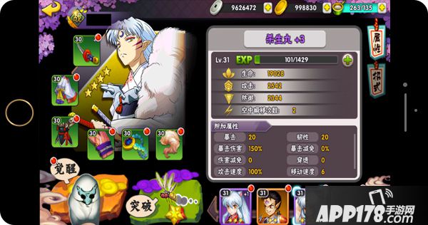 杀生丸的武器有三把,天生牙、铁碎牙和斗鬼牙,目前阶段大家用的最多的还是天生牙。在武器炼化镶嵌的过程中,当选择高攻宝石,增强起输出优势。充分发挥杀生丸大杀器碎肉机的特色,争取能将其打造成一把超越犬夜叉的尖刀利刃。
