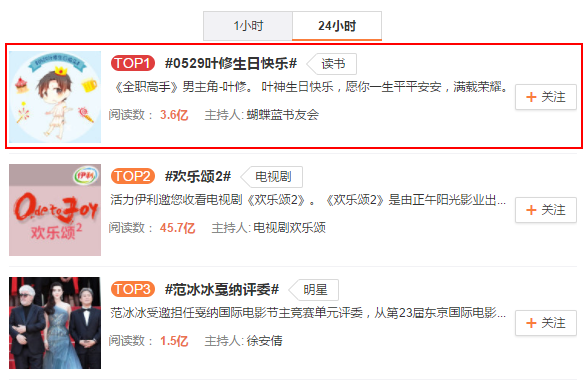【#0529叶修生日快乐#再进微博话题热榜】