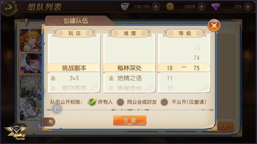 玩家在达到一定等级后便会开启组队副本模式,点击右下角的“组队”按钮,进入组队界面。由左到右依次是选择模式,选择要挑战的副本和等级限制。玩家可选择队伍公开的范围,如果没有固定的队友,建议玩家选择向同工会或者好友开放,以防遇到坑货。