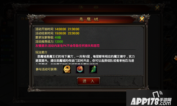 恶魔城是魔王们的地下巢穴,一共有9层,每层都有相应的魔王镇守,实力逐层提升。通往恶魔城的传送门定时开启,你可以选择组队或者单枪匹马进入恶魔城,击败魔王的队伍将获得丰厚的战利品。
