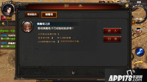⑤镇魔塔:前期后期主要获得经验方法之一。于副本一样,每日一次免费机会,购买副本卷轴课额外增加2次机会。开通青铜VIP可额外增加1次机会。开通黄金VIP额外赠送2次机会。