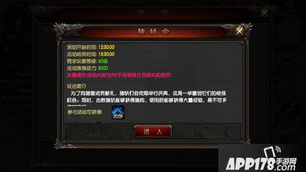 ③每日活动:每日中午12:30到1:30开始的猪洞活动,击杀猪王或猪皇可获得大量的猪肉,使用猪肉可获得大量经验奖励。