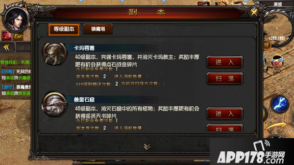 ④等级副本:6个副本每日都会有1次免费挑战机会,购买副本卷轴课额外增加2次机会。开通青铜VIP可额外增加1次机会。开通黄金VIP额外赠送2次机会。前期升级还是很客观的。
