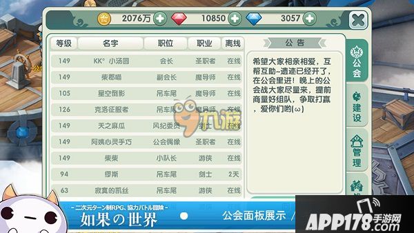 如果的世界公会怎么创建,公会有哪些玩法活动任务呢?每款游戏中都少不了帮派公会,与公会兄弟们一起下副本打怪就是最激情的事情。下面APP178手游玉米就来详解公会的创建条件以及公会活动玩法大全,一起看看吧。