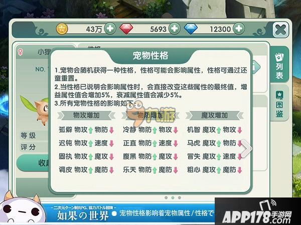 3、宠物性格:在如果的世界中,每个宠物都有自己独特的性格。不同性格的宠物影响着他们的属性变化。当然也不是每个宠物的性格都反复无常,努力、勇敢、认真等优秀的宠物仍会以平和心一直陪伴你哦。你想要调教哪一种宠物呢?