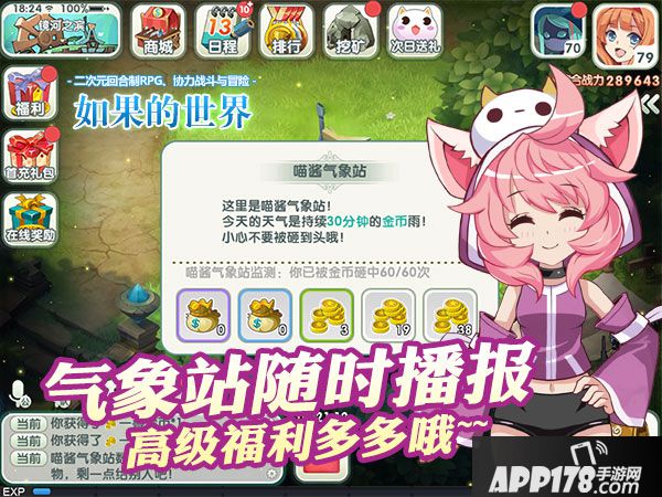 当喵酱气象站的活动开启时,小伙伴们不仅会遇到经验雨、宝石雨和钻石雨,还有很大概率会被金币雨砸到,在地图上站着就可以领钱的活动,小伙伴们要不要来尝试一下~~
