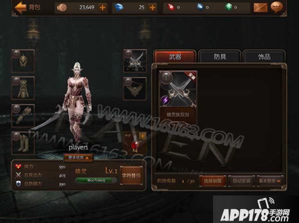 背包菜单中将显示游戏角色目前的装备状况以及角色所拥有的武器、防具、饰品,玩家可以在该菜单中进行装备更换
