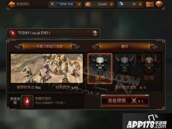 在这个界面中将会显示探索的起止时间、完成奖励和难度等,而且每一天的挑战内容和奖励都是不一样的哦。最最重要的就是一定要仔细看看推荐攻击和防御,每周探险中最好你的战斗力高于推荐战斗力!