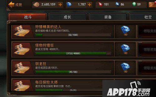 【4】重复成就任务获取钻石,进入角色成就系统,里面会有很多可以获取钻石的成就,这些成就我们不需要刻意的去完成,在升级做装备的过程中不知不觉他们就自动完成了,哈哈!一个成就奖励180钻,积少成多嘛。还有社交系统,我们每天赠送给好友友情度,赠送到一定额度也可以获取钻石哦。
