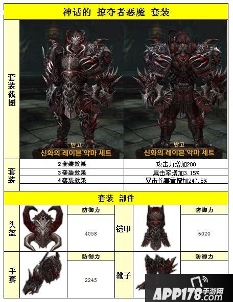 以上就是raven掠夺者盘古神话恶魔套装属性图鉴的全部内容,希望能给喜欢神话恶魔套装的小伙伴们带来帮助。更 多相关攻略稍后送上~请继续关注APP178手游网~更多精彩期待你的分享~