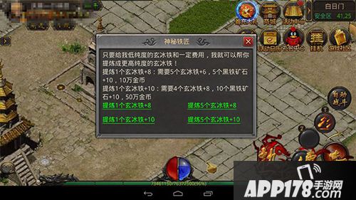 白日门城内除了常规的首饰店、仓库、药店等商店,神秘书商旁边还特别设立了NPC神秘铁匠,玩家可以通过他将低级的玄冰铁提纯为高级,为玩家强化装备节约了不少的时间和强化材料。