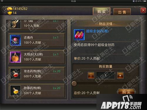 行会商店就在每日行会任务发布人的旁边,商店的药品还是很多的,超级金疮药、超级魔法药、还魂丹、攻击药、水防御药水,甚至还有小飞鞋,最重要的是,有大太阳水!虽然价格不便宜,但是确实是一种低成本获得药品的方法哦!