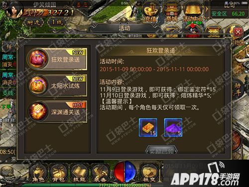 光棍节越来越近了,除了双十一的买买买,热血传奇手机版也有很多活动不容错过,今明两天登录就送鉴定符和熔炼精华,机会不要错过。