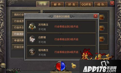 行会BOSS一共有三种,沃玛教主行会2级开启,白野猪行会3级开启,祖玛教主行会4级开启,开启时间由行会会长设置,设置后次日1时生效,比如设置沃玛教主21点开启,那么第二日20:57分,本行会内所有玩家就可以进入场地了,21点准时会刷新BOSS,击杀后所有物品均有两分钟保护时间不可捡取,两分后行会成员均可捡取,行会boss等级越高,所曝出装备也就越好,击杀行会boss后,会按照伤害排名给予玩家宝箱奖励。