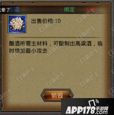 高粱可酿制出高粱酒,临时增加最小攻击,酿出酒后,不同品质的同类酒属性不同,品质越高属性越高,实际提升效果随着酒量的提升而提升。
