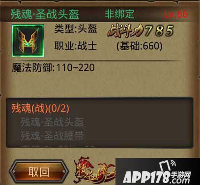 概述:残魂装备可以用以和圣战装备比对,残魂装备虽有不同的佩戴等级限制,但装备的基础战斗力要比圣战装备高,但具体属性要差一点。不过残魂装备除了基础属性外,有额外的套装属性加成,即装备残魂·圣战宝甲和残魂·圣战皮靴,可以为角色增加10点的闪避值;装备残魂·圣战头盔和残魂·圣战腰带,角色可以获得20点的韧性加成。