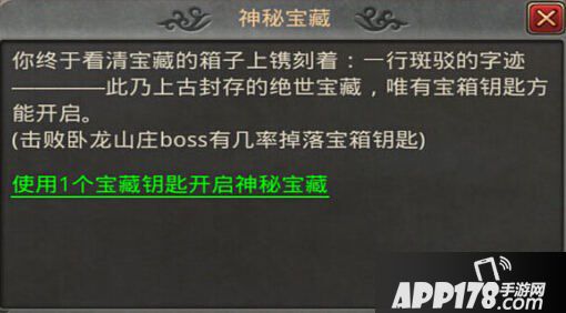 击败卧龙庄主后,还可前往卧龙山庄(62,25)使用宝藏钥匙*1开启神秘宝藏,获得卧龙卷轴-残甲等物品。