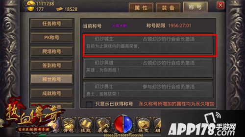 万人之上,至高巅峰。目前游戏中最高的荣誉称号,仅有幻境沙巴克获胜行会的会长可激活该称号。附加属性为:物防100-100,魔防100-100,韧性+20。
