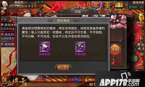 女方接受男方求婚,双方结为夫妻后。在月老处可以绑定一枚婚戒,绑定婚戒后,该枚婚戒会具有免爆的属性。当玩家更换装备时,也可以在月老处取消绑定婚戒,并重新绑定新的戒指。绑定后的戒指不可交易、不可销毁、不可分解、不可合成,离婚后绑定效果自动消失。