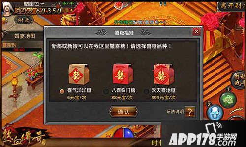 在婚宴地图内,新郎或新娘可在喜糖福娃处选择喜气洋洋糖、八喜临门糖、欢天喜地糖三种喜糖礼包发放给宾客。1分钟后,喜糖福娃附近将爆出一堆喜糖,1分钟保护时间后,地图所有玩家均可拾取。喜糖礼包内含金币和礼券。其他玩家也可通过婚宴地图内的红包福娃向场景内新娘、新郎发送红包。