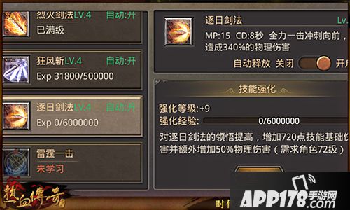 7、技能:在学习新的技能后,经常使用技能可以增加对应技能的经验值,经验值累计达一定数值,即可升级。在技能满级,且拥有技能秘籍后,可开启技能强化,消耗技能点进行技能强化可以提升角色的战斗力。