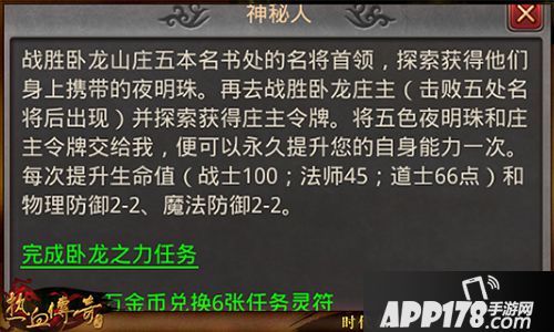 此外,卧龙山庄里的卧龙之力任务也是快速提升战斗力的一个重要途径。战胜卧龙山庄内的五本古书名将和卧龙庄主,使用任务灵符探索遗骸,可获得五色夜明珠和庄主令牌。收集五色夜明珠和庄主令牌可在神秘人处提交任务,并根据职业的不同获得生命值、物理防御和法术防御属性的提升,战斗力也会随之增加。完成卧龙之力任务提示的属性值是永久的,所以这个任务是一定要做的!