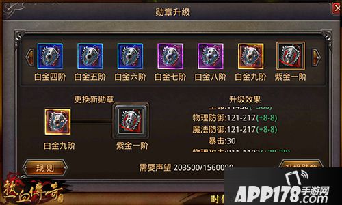 3、勋章等级:玩家通过皇城悬赏、除魔任务获得声望来升级勋章,使用声望令也可直接获得声望值。勋章品阶分为青铜、生铁、黑铁、白银、黄金、白金、紫金、赤金和钻石9个段位,每个段位有9个品阶,勋章最高品阶为钻石9阶。勋章等级和品阶预告,所提供的属性加成和战斗力加成越多。