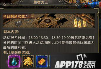 打开活动日历中的限时活动点击胜者为王就可以成功的进入副本了,既然是限时活动玩家就一定要注意时间了,胜者为王的活动分为2个时间段,其一就是下午3点到3点20,其二就是晚上9点到9点20,玩家们要注意了因为胜者为王的活动时间为20分钟,所以错过这2个时间段也就只能等待明天了。