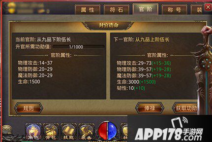 官阶是热血传奇手机版刀光剑影版本中出现的新玩法,不过这个新玩法开启是有要求的,玩家60级才可以开启一个从官之路的任务,这可是玩家步入贵族的第一步千万不能马虎哦,官阶也是分高低的在游戏中官分九品,每个品级都有4个等阶,玩家可以用功勋值来提升自己的官位,功勋值的获取也非常简单,玩家可以通过完成功勋任务来赚取。