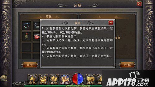 此处需要注意的一点是,金刚石是绑定无法交易的,玩家只有通过上述两个途径获得金刚石,而无法通过交易行购买。分解裁决之仗、骨玉权杖和无极棍这三大装备才有几率获得金刚石,其他50级以上的稀世装备分解时是无法得到金刚石的。此外,分解金刚石装备也会返还一定数量的金刚石。