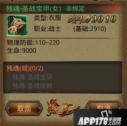 概述:残魂装备可以用以和圣战装备比对,残魂装备虽有不同的佩戴等级限制,但装备的基础战斗力要比圣战装备高,但具体属性要差一点。不过残魂装备除了基础属性外,有额外的套装属性加成,即装备残魂·圣战宝甲和残魂·圣战皮靴,可以为角色增加10点的闪避值;装备残魂·圣战头盔和残魂·圣战腰带,角色可以获得20点的韧性加成。