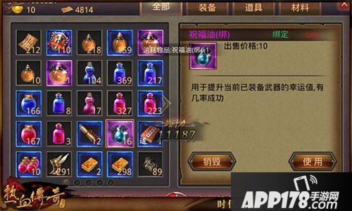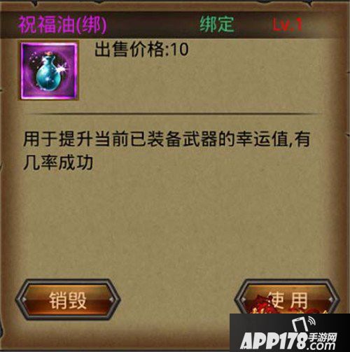 使用祝福油可以提升已装备武器的幸运值,1瓶祝福油使用成功可以获得1点幸运值。大家在使用祝福油的时候,初期装备幸运值+3成功几率较大,可以直接喝。后期成功率略有降低,可以采取连喝3瓶,这样成功几率会有所提高。
