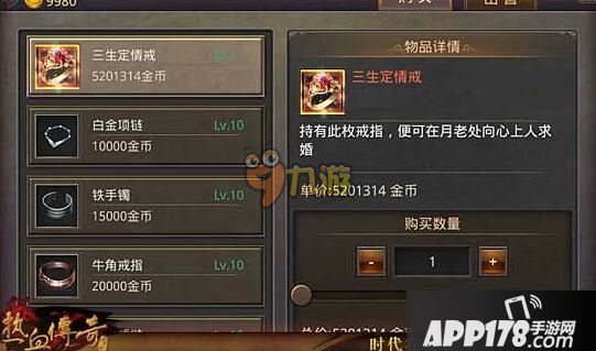 满足条件的玩家两人组队,在首饰店老板处使用5201314金币购买一枚“三生定情戒”。持有该戒指后,可在月老处向心上人求婚。通过比奇地图前往姻缘神殿可找到月老。男方使用三生定情戒向女方进行求婚,女方接受求婚,双方即可结为夫妻