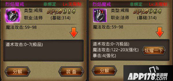相应的首饰强化到一定级别,就会出现对应的特殊属性,请看下图(注意只有赤月首饰及其以上的首饰才可强化到20,赤月以下的首饰最高只可强化到16级)。现拿强化到15与强化前对比。