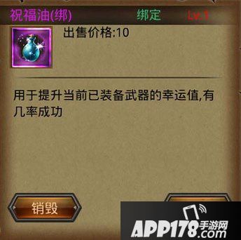 使用祝福油可以提升已装备武器的幸运值,1瓶祝福油使用成功可以获得1点幸运值。大家在使用祝福油的时候,初期装备幸运值+3成功几率较大,可以直接喝。后期成功率略有降低,可以采取连喝3瓶,这样成功几率会有所提高。